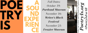 “Poetry Is – A Sound Experience” is a local performance collective uniting poets and musicians to create unique poetry “reading” experiences with improvisational music. Sometimes entirely unrehearsed, these music and poetry moments are unpredictable and joyful community-building sound-bites that transform the atmosphere of the poetry reading into a dynamic space.